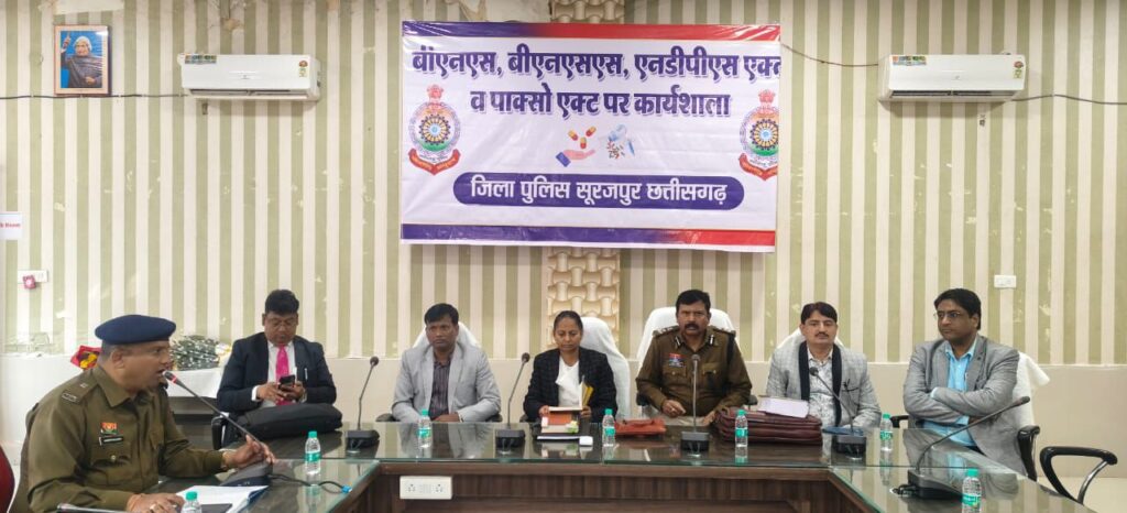 *सूरजपुर *दिनांक 15/12/2025 को अपराध विवेचना की गुणवत्ता बढ़ाने और साक्ष्य संकलन को मजबूत करते हुए आरोपियों को सजा दिलाने को लेकर रविवार, 14 दिसम्बर 2025 को जिला पंचायत के सभाकक्ष में बीएनएस, बीएनएसएस, एनडीपीएस एक्ट व पाक्सो एक्ट की 01 दिवसीय कार्यशाला का शुभारंभ जिला एवं सत्र न्यायाधीश सूरजपुर श्रीमती विनीता वार्नर द्वारा किया गया। इस अवसर पर कलेक्टर श्री एस.जयवर्धन, न्यायाधीश श्री मानवेन्द्र सिंह, श्री सुमित कुमार हर्षमाना, श्री आनंद प्रकाश वारियाल, डीआईजी व एसएसपी श्री प्रशांत कुमार ठाकुर मौजूद रहे। कार्यशाला में माननीय न्यायाधीशगण द्वारा नवीन कानूनों, प्रमुख धाराओं और कानूनी प्रक्रियाओं की बारीकियों से पुलिस अधिकारी व विवेचकों को अवगत कराया गया। कार्यशाला में विवेचकों के द्वारा विवेचना से जुड़े प्रश्नों को समाधान माननीय न्यायाधीशगण द्वारा किया गया।